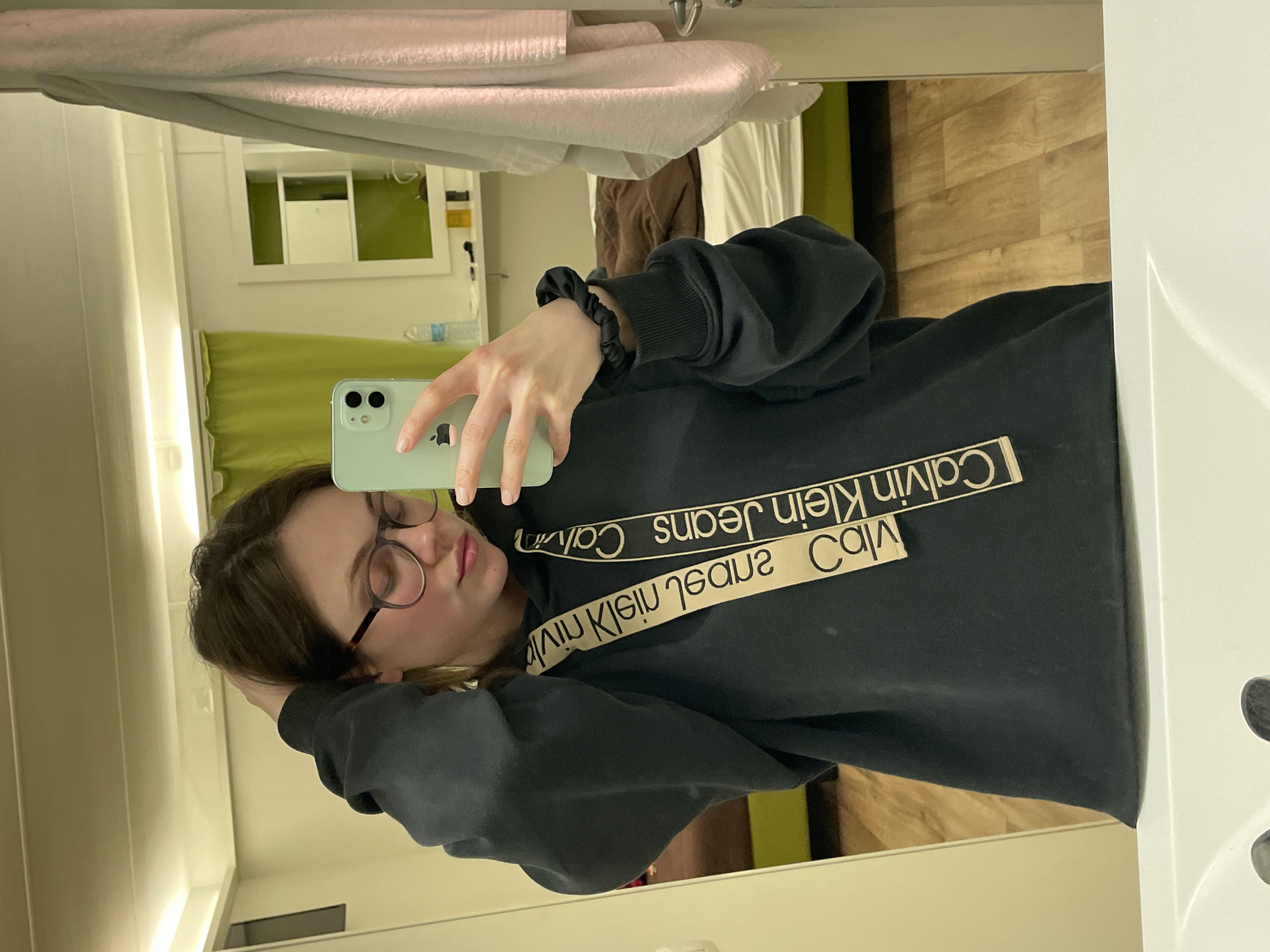 young woman with brown hair and glasses taking a selfie in a mirror. She is wearing a black sweatshirt with a "Calvin Klein Jeans" logo on the chest. The background appears to be a bathroom, with white towels hanging above and a view of a room with a green wall and a window in the reflection. Based on the interior design and layout, it is possibly a room in a hotel or apartment. There is no indication in the image that the location is Venice, Italy.