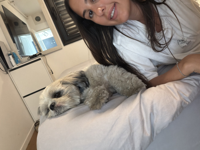 The image depicts an indoor scene within a residence in Tel Aviv, Israel. A light-colored dog, identified as a Shih Tzu with cream and gray fur, rests on a light gray bed. Its head is positioned towards the left, with eyes partially closed. In the upper right quadrant of the frame, a female subject's face is visible from the eyes to the upper chest, angled towards the camera with a slight smile. She has long dark hair and brown eyes, wearing a white long-sleeved t-shirt with a black line-art eye emblem and the text "Terra Bassa" on the left chest. Her right arm, featuring a silver chain bracelet on the wrist, is also visible, resting on the bedding. The background to the left displays a white dresser or nightstand with two visible compartments. On its surface are various white and blue bottles, alongside a black electrical cable. Above this, a rectangular mirror reflects an interior space and a window with black horizontal blinds/shutters, showing an indistinct exterior view beyond. Another section of a dark window shutter is partially visible on the far right. The interior walls are light-colored.