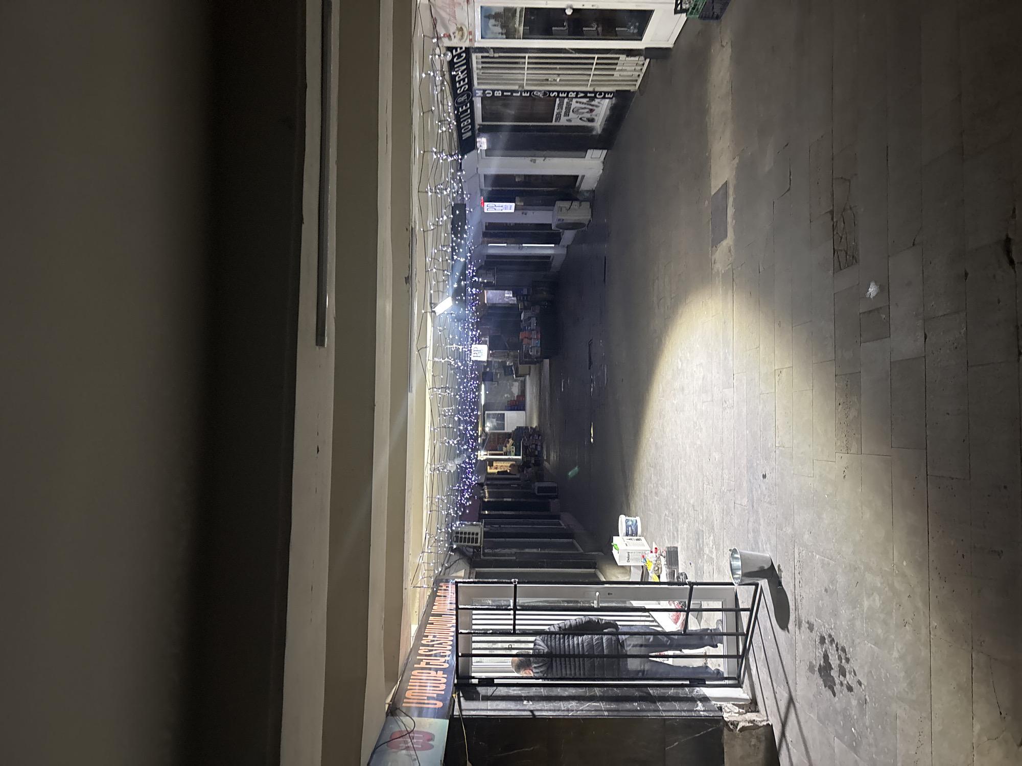 The image depicts a narrow, enclosed walkway with shops on one side, likely in Yerevan, Armenia. The walkway is illuminated by a series of overhead lights and Christmas-style string lights. The pavement is tiled and shows signs of wear and repair. On the right side, a person in a dark jacket is standing near a railing. Shopfronts line the left side of the walkway, with signage in Armenian visible on some of the storefronts. Merchandise and boxes are visible outside some of the shops.