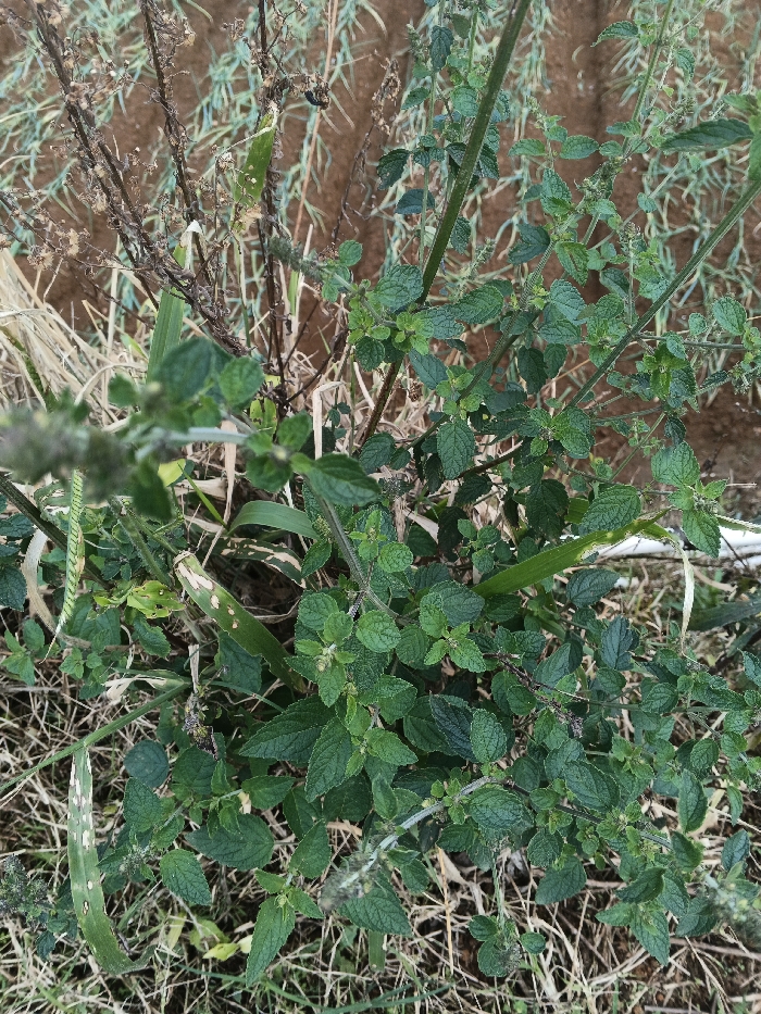 - "The image showcases a vibrant green plant with small, rounded leaves and textured stems, possibly mint or a related herb, thriving amidst dry grass and plant debris" by FM-KICT13, licensed under CC BY 4.0