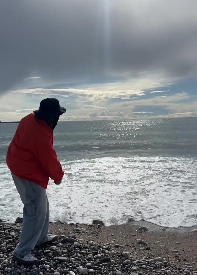 A person stands at the edge of a rocky beach, facing the ocean. The person is wearing a black hat, sunglasses, a red jacket, light blue jeans, and white shoes. The ocean is choppy with white waves, and the sky is partly cloudy. There is a building visible in the distance. The person is standing with their hands in their pockets.