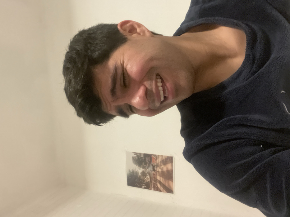 An adult male, approximately 20-40 years old, is depicted in an indoor setting. He has dark, wavy hair, and a visible five o'clock shadow or light stubble. His facial expression indicates strong amusement or laughter, characterized by partially closed eyes, raised cheeks, and an open mouth revealing white teeth. He is wearing a dark blue, long-sleeved, crew-neck garment, consistent with fleece or a similar soft fabric. The individual is positioned against a plain, light-colored wall. To the left of the subject, a vertically oriented poster or picture is affixed to the wall, displaying an illustration or photograph of an outdoor street scene featuring a crosswalk, trees, and several dogs. The image is taken from a low angle, looking upwards at the subject. The specific location within Canet de Mar, Spain, cannot be determined from the visual elements present in this indoor, residential-like scene.