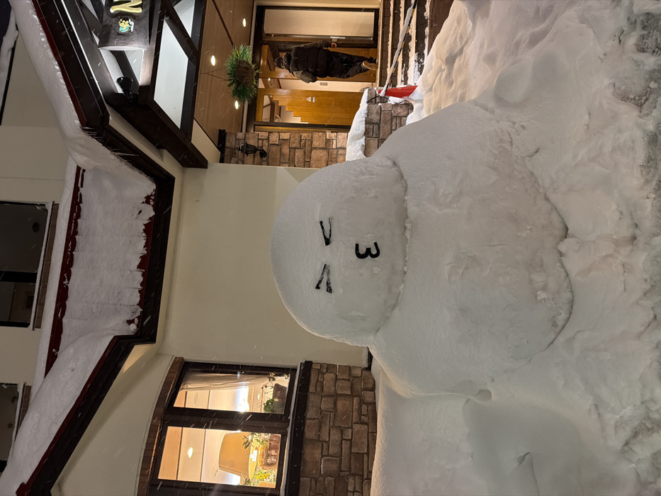 An image captured in Kutchan, Japan, depicts a snow-covered street scene in front of a multi-story building, likely a hotel or residence, during nighttime or low-light conditions with visible snowfall. In the foreground and central to the image is a two-tiered, rounded snow sculpture resembling a snowman, covered in fresh snow. Its upper section features a face drawn in black, characterized by two horizontal V-shapes for squinted eyes and a horizontally elongated "3" shape for pursed lips. The sculpture is situated on a substantial snowdrift that covers the ground. The building behind the snow sculpture features a stone-textured lower facade, transitioning to a light-colored upper wall. On the left, a bay window with dark frames reveals an illuminated interior, where a lamp with a wide shade and potted plants are visible. The roofline above this section is heavily laden with snow, forming thick cornices and visible icicles. To the right, the main entrance area features dark wooden beams under the eaves and additional stone work around the doorway. An exterior wall-mounted sconce provides illumination. A dark green hanging planter is suspended above the entrance. Steps, partially cleared of snow but with significant snowdrifts on either side, lead up to a set of wooden double doors. A red traffic cone is partially buried in snow near the base of these steps on the right. One individual, viewed from behind, is ascending the steps towards the building's entrance. The person is wearing a dark, possibly padded, jacket or vest over dark clothing and appears to be wearing dark shoes. The overall environment is dominated by heavy snow accumulation, indicating winter conditions.