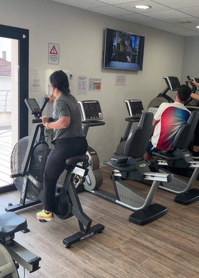 interior of a fitness room, presumably in a hotel. Three people are engaged in exercise on different machines. A woman with dark hair pulled back is using a Rogue air bike, working her arms and legs to power the fan. A man wearing a colorful shirt is seated on a recumbent bike, exercising. Another woman is on a step machine. A television is mounted on the wall, playing content. Various warning signs and informational notices are posted on the walls. The floor is a light wood grain. A rowing machine is visible on the left side of the frame. Outside the door, a glimpse of residential housing can be seen.