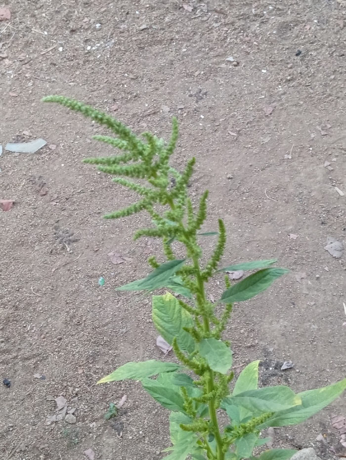 A single, vibrant green plant rises amidst a field of dry, grey-brown soil. Its slender stalk is adorned with leaves, and the plant is crowned with feathery, elongated green inflorescences. These clusters of small green structures give the plant a textured, almost fuzzy appearance. The leaves are a bright, healthy green, contrasting with the dry, desolate ground surrounding it.