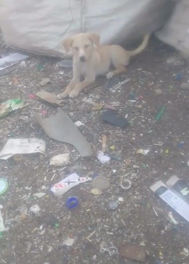 light-colored, possibly yellow, puppy lying on the ground which is covered in trash. The trash includes plastic scraps, wrappers, small pieces of metal, and cardboard. Behind the puppy is a large white sack. The camera then focuses on the puppy, which stands and walks towards the camera, eventually getting close enough that the viewer can see the puppy's mouth and tongue. The dog appears to be approaching the person holding the camera.
