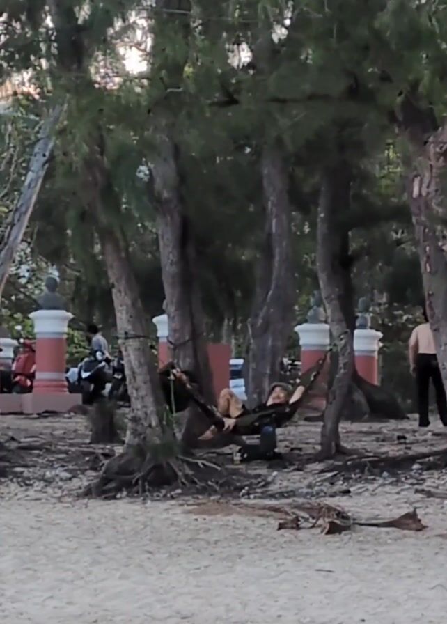 scene at a beach park with several pine trees providing shade on the sandy ground. In the center, a person is relaxed in a hammock, seemingly enjoying a rest. To the left, some people are gathered by a row of parked motorcycles next to a red and white fence. To the right, a shirtless man walks casually by. The light suggests it is either early morning or late afternoon. There are scattered dry leaves on the beach.