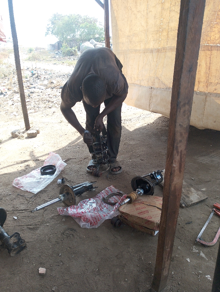 - "In an outdoor, unpaved workshop in Kagini, Nigeria, a dark-skinned male, wearing a dark t-shirt, dark trousers, and open-toed sandals, is observed bent over, actively compressing a spring on a vehicle suspension strut assembly using a specialized tool" by FM-JRKle2, licensed under CC BY 4.0