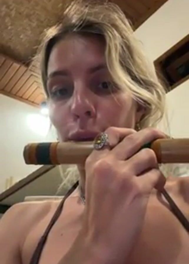 woman with blonde hair and a brown bathing suit playing a flute. She is indoors, and the ceiling above is made of a light-colored woven material. She wears a large ring on her left hand. The flute is made of bamboo. A light fixture is visible in the background.