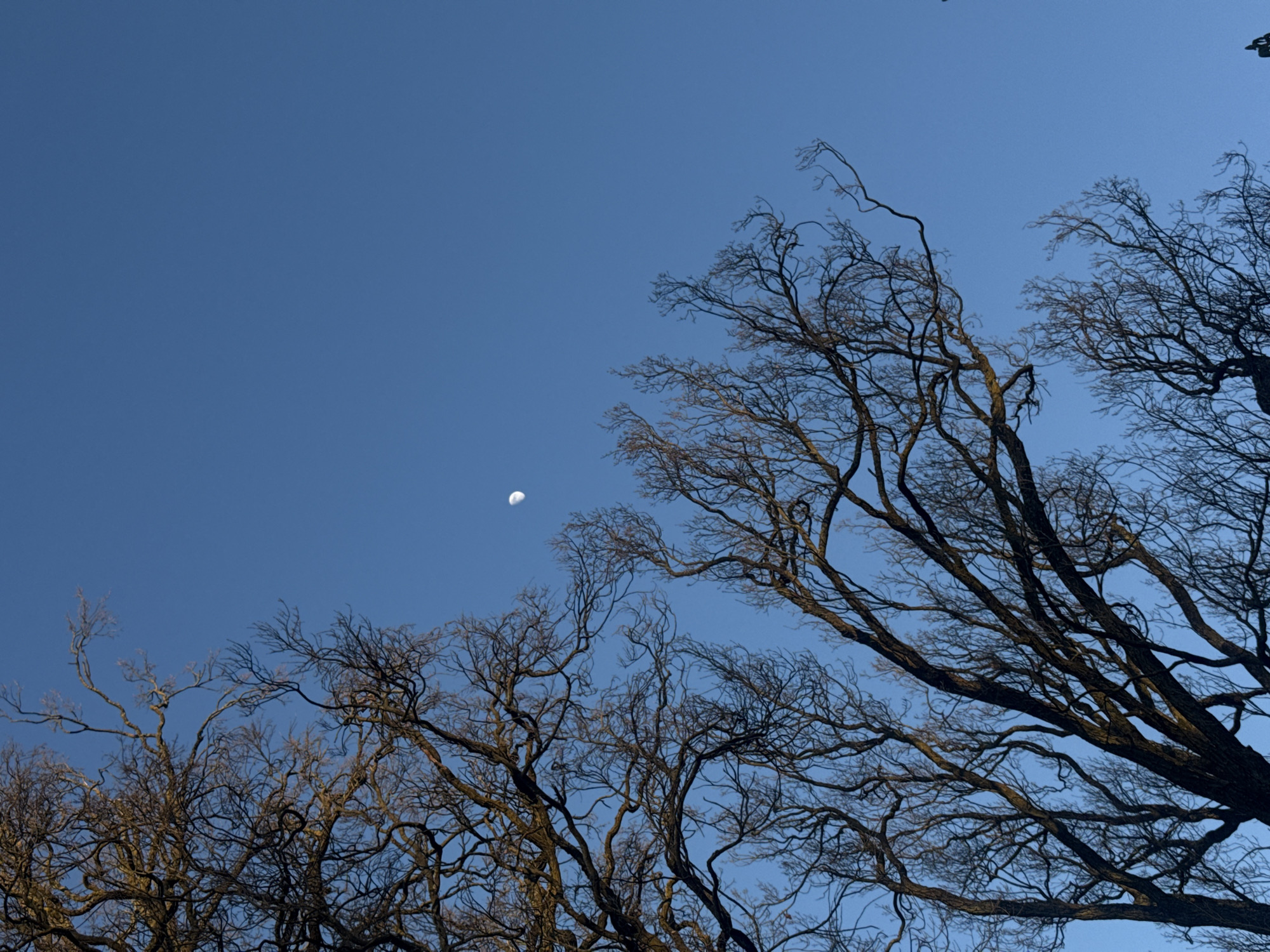 The image depicts a clear blue sky above Bad Nauheim, Germany, featuring a visible waxing crescent moon in the upper-middle left quadrant. The lower half and left side of the frame are occupied by a dense network of bare, dark tree branches belonging to at least two deciduous trees, silhouetted against the bright sky. Some branches exhibit subtle brownish-gold highlights on their upper surfaces, suggesting illumination from an external light source. No people, animals, or man-made structures are present. No specific actions or interactions are discernible.