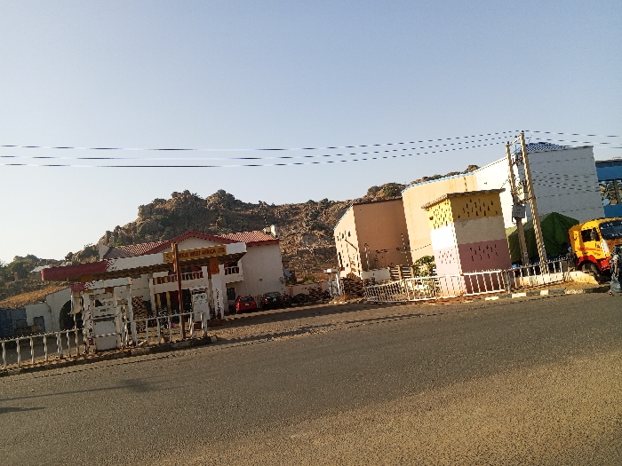 This daytime image depicts a street scene in Kabong, Nigeria. A dark grey asphalt road occupies the lower portion of the frame. To the left, a commercial complex with a red-tiled roof and white walls is visible, featuring a prominent canopy covering multiple fuel pumps, identifying it as a petrol station. A sign bearing the text "SUN WEST AFRICA LTD" is affixed to the canopy structure. Several passenger vehicles, including red cars, are parked within the station's perimeter, which is demarcated by a white metal barrier along the roadside. To the right of the petrol station, additional buildings include a light brown structure and a multi-tiered utility box or kiosk colored in horizontal yellow, pink, and white stripes. A utility pole with multiple overhead wires stands in the mid-right. On the far right, a yellow and red tricycle vehicle is partially visible. The background is dominated by a rugged, rocky hillside rising against a clear, light blue sky. No discernible individuals are present within the scene.