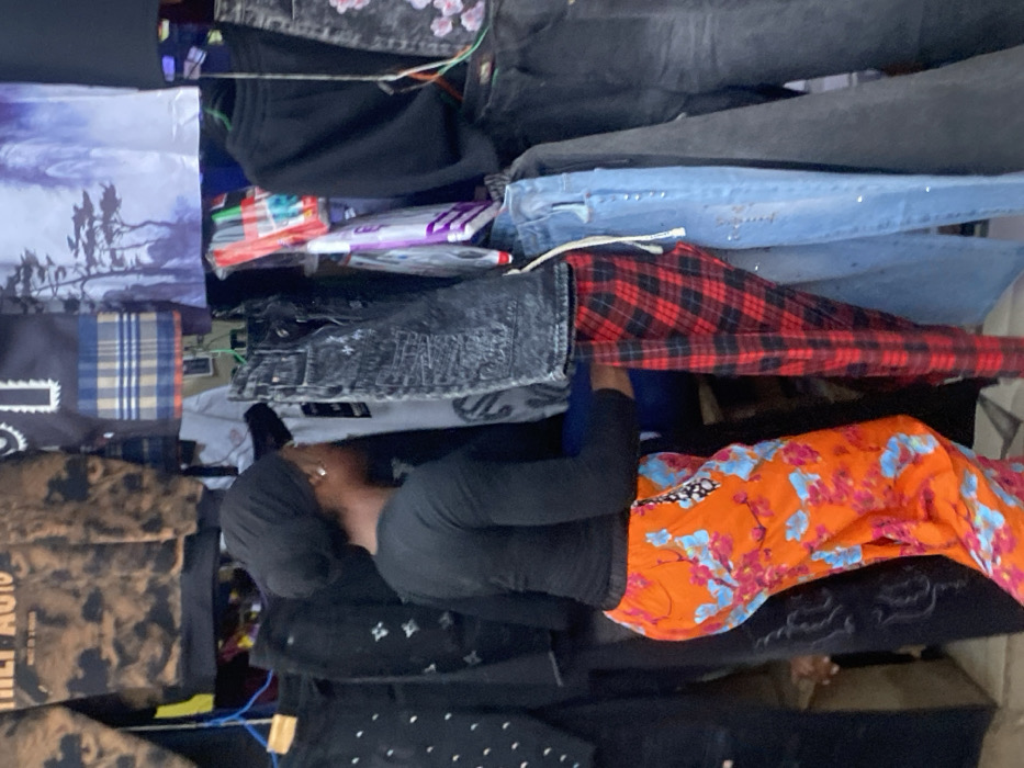 A woman in a black shirt and floral orange skirt sits surrounded by stacked clothing. Jeans in various washes, including black, light blue, and distressed gray, are arranged above her. Plaid fabric and patterned textiles add color to the scene. The woman's dark head covering contrasts with her visible earring. The composition suggests a clothing display or a vendor's setup.
