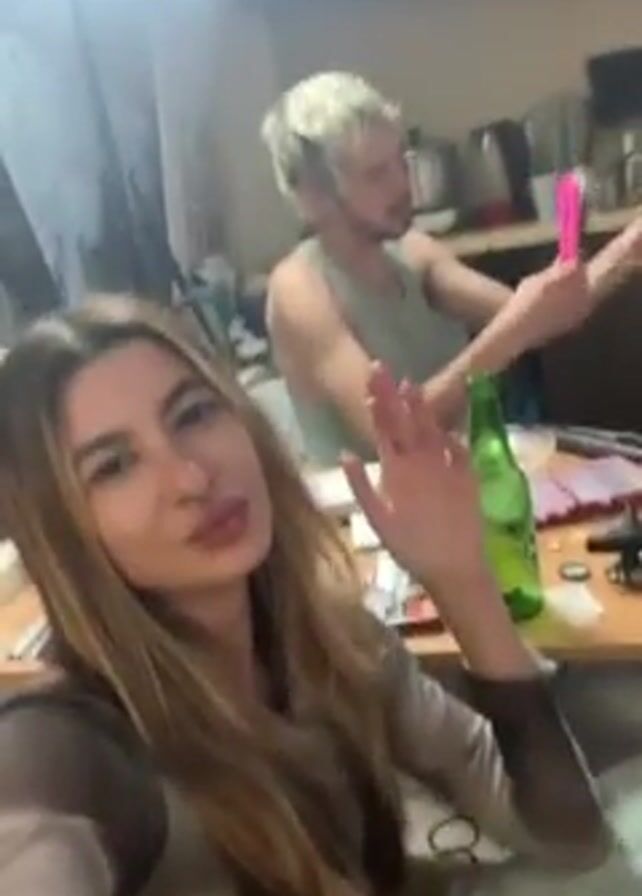 two people in what appears to be a room. A woman in the foreground, with long brown hair, is smoking a cigarette. She exhales smoke towards the camera. In the background, a man with blonde hair is sitting at a table, seemingly involved with some props or objects. There is a green glass bottle on the table along with miscellaneous items. The room has a casual and cluttered appearance.