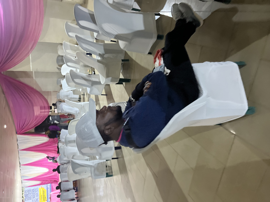 A person lies across three chairs covered in white fabric, legs extended and feet shod in gray. They wear dark pants, a blue top, and a white baseball cap. Rows of identical white-covered chairs line the room, with a pink and white draped backdrop visible in the background. The room has a polished, geometric-patterned floor. A banner with text is partially visible at the front of the room.