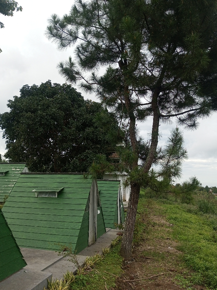 The image displays an outdoor scene in Abbireddygudem, India, under a cloudy, overcast sky. In the foreground and mid-ground, a series of at least three A-frame structures with green, horizontally planked roofs are arranged on a concrete walkway. The front façades of these structures are light-colored, possibly white or light grey, and feature a central vertical entryway. The A-frame closest to the viewer on the left has a small, light-colored, upward-slanted vent or awning near its peak. A prominent pine tree with a textured, multi-trunked base and dark green needle-like foliage stands to the right of the structures, on a grassy slope that extends to the right edge of the frame. In the background, a large, dense deciduous tree with dark green leaves is visible behind the A-frames. A portion of a larger, light-colored building with visible windows is discernible behind the A-frames and trees in the distance. No individuals or animals are present.