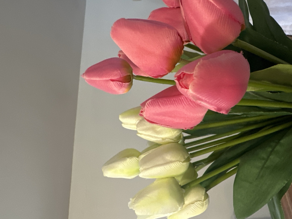 - "A bouquet of pink and white tulips stands against a blurred background" by FM-QRd2i1, licensed under CC BY 4.0