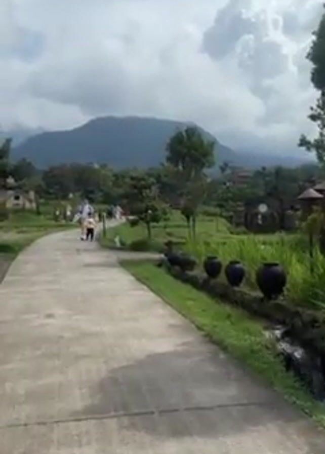 paved path leading through a rural landscape towards a distant mountain. The path is lined with grass, small trees, and occasional decorations such as large dark pots. To the left, there are small, whitewashed buildings. To the right, there is a rice paddy with lush green plants and a small stream running alongside the path. Several people are walking along the path in the distance, including a person holding the hand of a small child. The sky is overcast with large, puffy clouds.