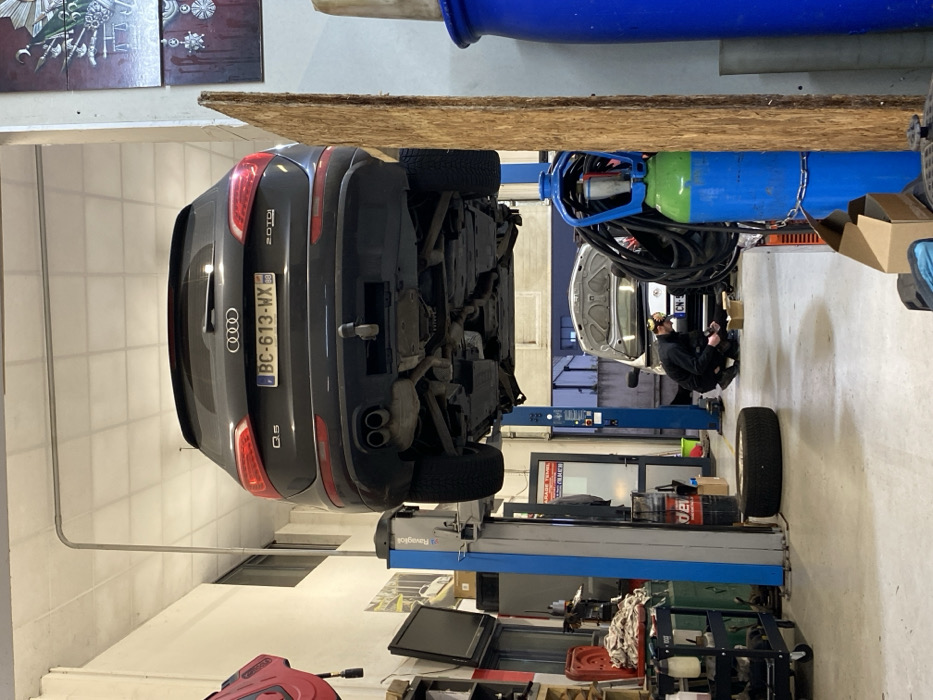 A gray Audi Q5 is elevated on a blue hydraulic lift in a garage