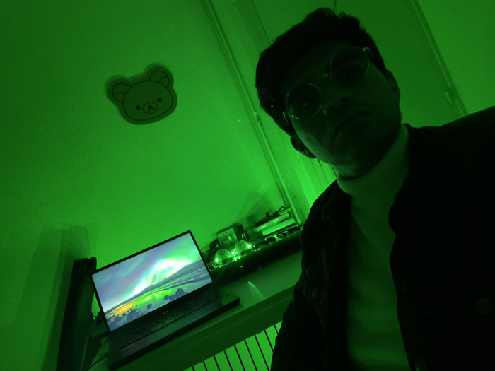The scene depicts an indoor environment in Canet de Mar, Spain, illuminated primarily by a strong green light source, casting a monochromatic tint over all visible elements. In the foreground, a male individual is positioned, looking directly towards the viewer. His face is largely obscured by shadow, but he is identifiable by round-rimmed glasses and a light-colored turtleneck sweater worn under a dark jacket. To the upper left, a light-colored, cartoon-style bear head sticker or emblem is affixed to the green-lit wall. In the mid-ground, a laptop sits open on a surface, its screen displaying an image of an aurora borealis, characterized by vibrant green and yellow light formations over a dark landscape. To the right of the laptop, on the same surface, several indistinct objects, some appearing cylindrical, are visible, also bathed in the green illumination.
