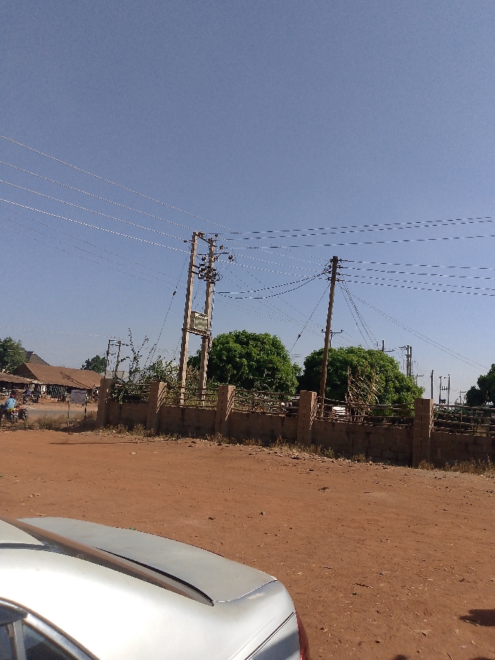 The image depicts an outdoor scene in Unknown, Unknown, under a clear, light blue sky. In the foreground, the rear section of a silver sedan is visible on the lower left, parked on unpaved reddish-brown dirt. This dirt ground extends across the entire lower portion of the frame. In the midground, a low masonry wall with regularly spaced pillars and horizontal rebar or wooden slats spans the width of the scene. Behind this wall, two large, round-canopied green trees are prominent. Two wooden utility poles, one with a mounted transformer and an illegible sign, support numerous power lines that traverse the upper half of the image. In the far background to the left, several simple structures with corrugated metal roofs are visible, with indistinct figures, including one on a motorcycle or scooter, present near a white signboard. Additional utility poles and green foliage extend into the distance on the right background.