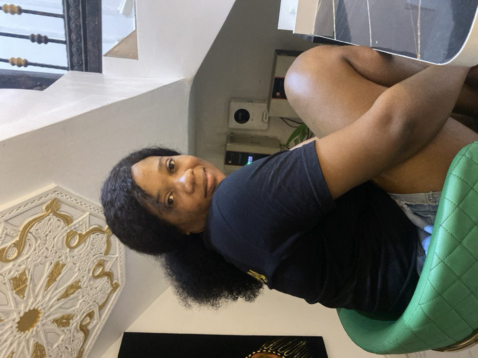 An adult female is depicted seated indoors in Galadimawa, Nigeria, turned slightly to her right and looking directly at the camera. She has dark, textured hair styled in a partial ponytail and wears a black short-sleeved t-shirt and light-colored shorts. She occupies a green, quilted upholstered chair with a visible metallic base. Her right arm is bent, resting on her knee, which is raised. A dark-patterned table with a light edge is visible to her right. The background features a white-painted staircase with dark metal railings. Beneath the staircase, several wall-mounted electronic devices are visible, including a white circular unit and multiple rectangular units, possibly utility equipment. A dark art piece with a golden design is on the wall to the left. Overhead, a white and gold decorative ceiling medallion with intricate patterns is visible.