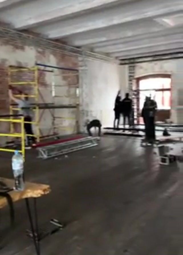 interior of a large, industrial-style room, possibly a studio or event space, that is undergoing setup. The room features exposed brick walls, high ceilings with visible beams, and wooden floors. There are several people inside, engaged in various tasks associated with setting up equipment. Some individuals are working on scaffolding, while others are near what appears to be lighting or camera equipment stands. There are truss structures in the room, both on the floor and suspended from the ceiling. The room has multiple windows, allowing natural light to enter. The lighting is generally bright, revealing the raw and somewhat unfinished nature of the interior. The overall activity suggests preparations for a photoshoot, a film shoot, or an event of some kind.