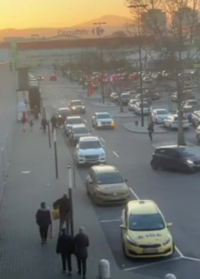 street scene near a Carrefour shopping center at sunset. Several people are walking on a sidewalk, and a line of cars is stopped in traffic on the street. A parking lot is visible in the background, filled with parked cars. The lighting suggests it is either sunrise or sunset, casting a warm glow over the scene.