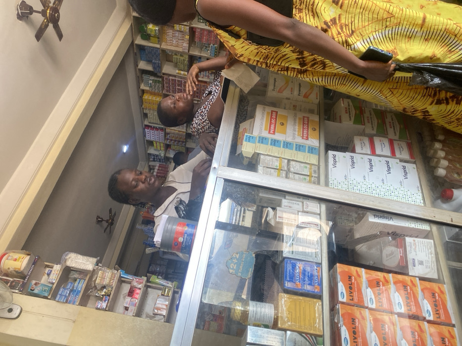 An interior shot depicts a retail transaction occurring at a pharmacy or drug store in Rido, Nigeria
