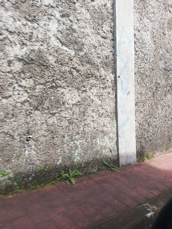 The image depicts a section of an outdoor environment in Matale, Sri Lanka, focusing on a textured wall and an adjacent sidewalk. The wall, predominantly mottled gray and dark, features a rough, stucco-like finish consistent with concrete or plaster. A lighter gray vertical concrete column or trim piece centrally divides the wall. This column exhibits faint blue graffiti or markings and a small dark circular indentation. To the left of the column, a short white pipe or conduit end protrudes horizontally from the wall. Green and white biological growth, possibly algae or moss, is visible at the base of the wall, extending along the full length of the visible section. The ground consists of reddish-brown pavers, laid in a pattern, forming a sidewalk directly against the wall. Several small green plants are growing between the base of the wall and the sidewalk. Bright natural light illuminates the scene, casting a clear shadow from the vertical concrete column onto the wall surface to its right. No individuals, animals, or active events are present.