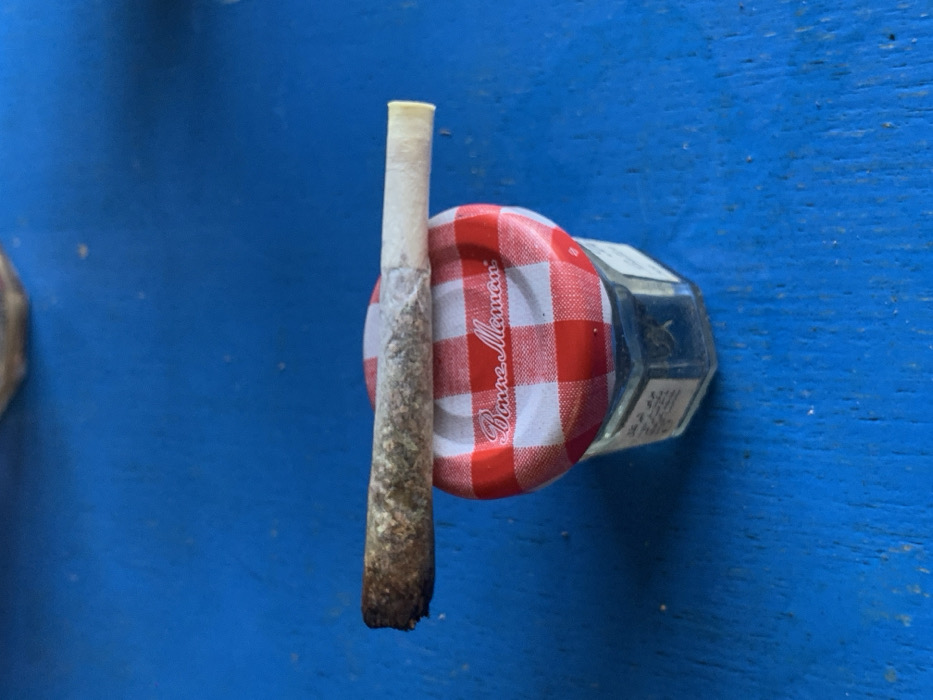 - "A partially smoked marijuana cigarette rests on a red and white checkered lid of a Bon Maman jam jar" by FM-Gn7EC2, licensed under CC BY 4.0