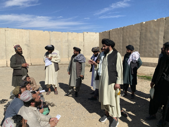 The scene depicts an outdoor gathering of approximately 15 to 20 adult males in Mandisar, Afghanistan