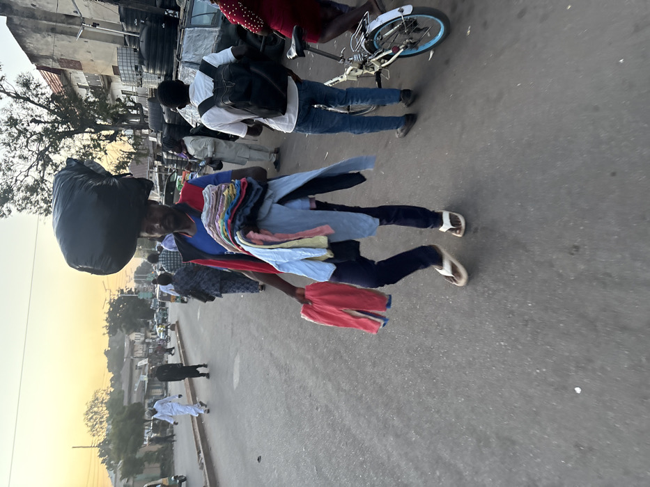 This image captures a bustling street scene in Jos, Nigeria, during what appears to be the late afternoon or early evening, indicated by the warm, low-angle sunlight. The primary subject is a dark-skinned man with a beard, walking directly towards the viewer on a paved road. He wears a blue t-shirt, a red and black sleeveless vest, dark trousers, and white flip-flops. He carries a large, dark, possibly plastic-wrapped bundle balanced on his head. In his left arm, he holds a stack of approximately 10-15 pieces of folded, multi-colored clothing, primarily light blues, pinks, and greens. In his right hand, he carries a smaller bundle of folded red/pink garments, possibly children's shorts or trousers. To the man's left, the paved road extends into the distance, showing light traffic, including at least two auto-rickshaws ("Keke Napep") and various pedestrians. One pedestrian in the mid-ground wears a full white traditional robe, walking away from the camera. Buildings line the street, appearing to be multi-story and functional, with some trees visible further down the road against a hazy, yellowish sky. To the man's right, more pedestrians are visible, including a young man in a white short-sleeved shirt and blue jeans, carrying a black backpack, standing next to a white folding bicycle with blue accents on its wheels. Behind these individuals, a commercial area is evident, featuring numerous black plastic water storage tanks stacked outdoors, along with piles of vehicle tires. The ground is asphalt, showing some minor wear and debris. The overall scene depicts a common urban market or commercial street environment.
