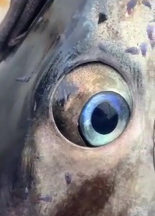 close-up of a fish's eye. The eye is light blue around the pupil and has a dark, black center. The skin surrounding the eye is a mottled gray.