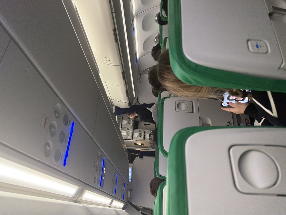 - "An interior view of an airplane cabin, with rows of seats upholstered in white and green" by FM-mVZIs1, licensed under CC BY 4.0