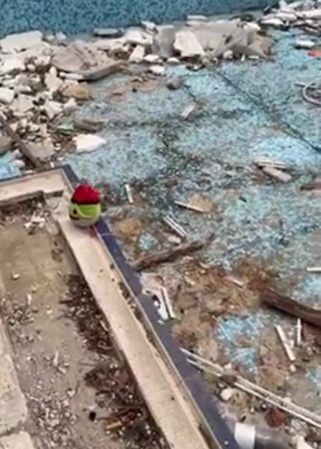 dilapidated indoor swimming pool. The pool is empty and filled with debris. The tiled bottom is cracked and discolored. There's a small plush toy with a red hat sitting on the edge. The pool is enclosed by a large metal dome structure, visible through the opening. The surrounding area appears overgrown with trees, suggesting the location has been abandoned.