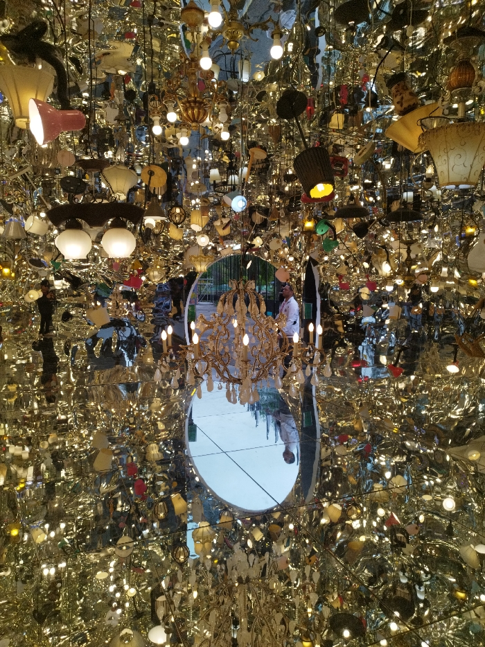 The image depicts the "A Llumina" installation by artist Guto Lacaz, located at the Museu da Casa Brasileira (MCB) in São Paulo, Brazil. The scene is an enclosed space densely filled with numerous electric lamps and chandeliers, suspended against and surrounded by highly reflective, irregular, mirror-like surfaces. Hundreds of diverse light fixtures, including bare bulbs, various decorative shades (conical, spherical, bell-shaped), and multi-branched chandeliers, emit warm light, creating a complex and fragmented visual field through their reflections. A prominent, ornate gold-colored chandelier with multiple candle-style bulbs and crystal-like drops hangs in the lower-middle portion of the frame. An oval-shaped opening in the center-right, framed by reflective material, provides a view to an exterior environment, revealing green foliage and a light-colored paved ground. A male subject, with short dark hair and wearing a white short-sleeved shirt, is partially visible within this opening, facing towards the left. His reflection is discernable directly below him within the opening. Additional fragmented and distorted reflections of other human figures are visible within the myriad reflective surfaces, particularly on the left.