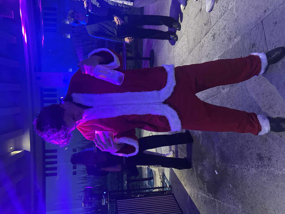 A person in a Santa Claus costume stands sideways, holding a bottle in one hand and a glass in the other. The backdrop features blue lighting and blurred figures. Another person holding a microphone is visible further behind. The ground appears to be stone or concrete. The scene has a festive, possibly party-like atmosphere.