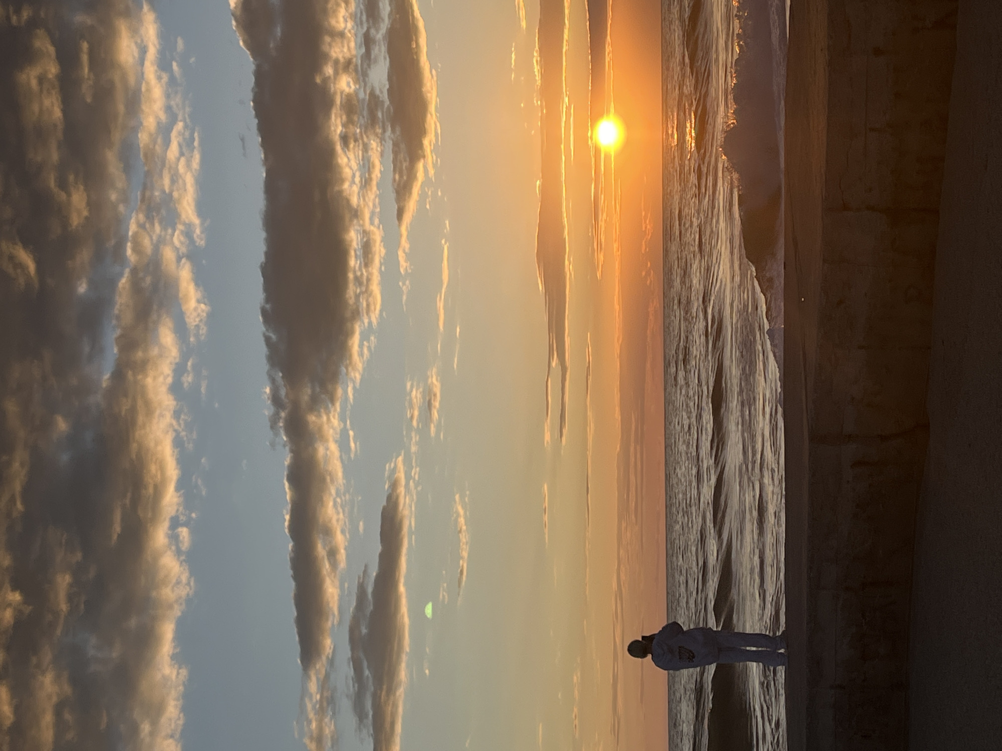 A horizontal eye-level shot captures a sunset over the Mediterranean Sea, likely in Alanya, Turkey, though specific landmarks are not visible to confirm the precise location. The sky is a gradient of colors, transitioning from a lighter blue with textured white and gray clouds on the left to a vibrant orange around the setting sun in the center-right. The sun's light reflects vertically down the water, creating a shimmering path. A figure, seemingly a person, stands on a concrete structure adjacent to the beach and water's edge. The person is facing the sea, silhouetted against the bright horizon. The waves are visible, creating textured lines on the water's surface. To the right, the concrete structure extends into the frame, partially obscuring the scene.