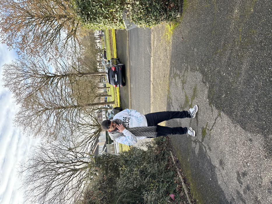 The image presents an outdoor daytime scene in Caen, France, depicting a residential area bordering a park. A single adult male is positioned in the foreground on a cracked asphalt pathway. He wears a light-colored, possibly tie-dye, hooded sweatshirt with a graphic, dark blue jeans, grey sneakers with white accents, sunglasses, and a grey patterned scarf. The man's right hand is raised to his mouth, holding a cigarette or vape, from which white vapor or smoke is visible. His left hand rests in his front left pocket. To the immediate left and right of the pathway are dense green hedges. Beyond the pathway lies a paved street where a dark blue/black Ford Focus hatchback, bearing French license plate CH-688-VP, is parked on the right. A silver vehicle is partially visible behind it. The street abuts a grassy park area containing multiple tall, bare deciduous trees, indicating a cooler season. In the background, residential buildings with light-colored facades and dark roofs are discernible. The sky above is partially cloudy. Patches of moss are visible on the asphalt and along the edges of the pathway.