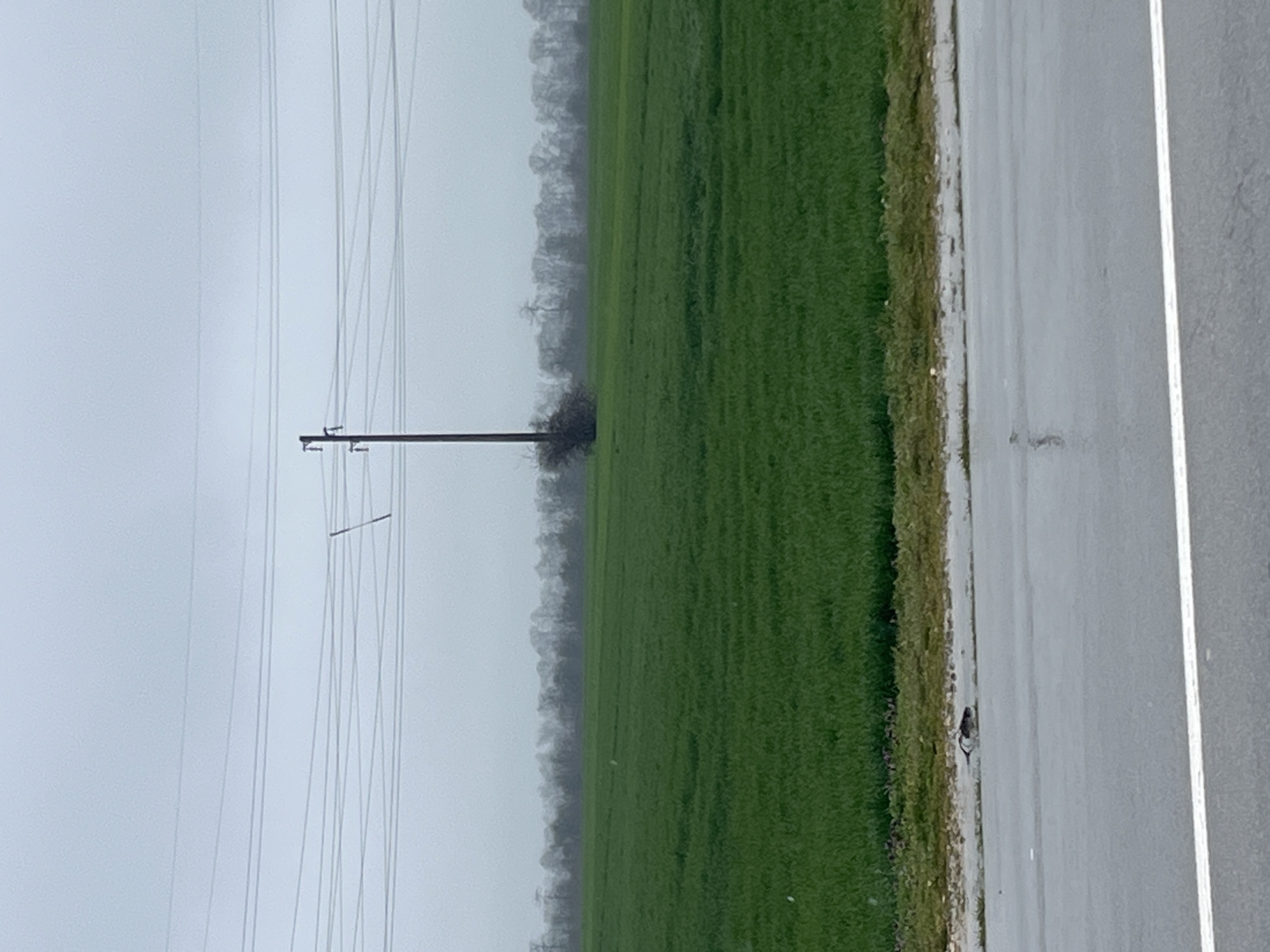 A field of green grass sits adjacent to a grey asphalt road. A power line pole stands tall in the field. The sky is overcast and grey. It is a rural area. The city of Kavarna, Bulgaria cannot be inferred.