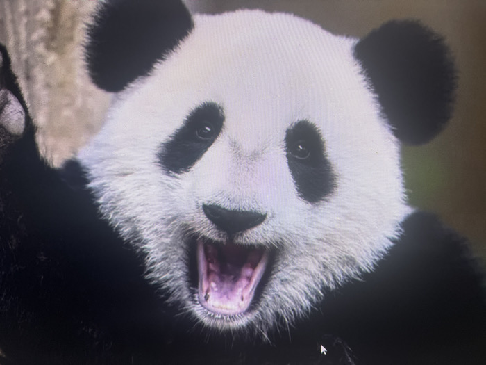 A close-up shot features a giant panda. The panda's black fur frames its white face, accentuating its round, dark eyes and the black patches around them. Its mouth is wide open, revealing a pink interior. The panda's fur appears fluffy, and its expression is cheerful. A faint cursor is visible at the bottom.