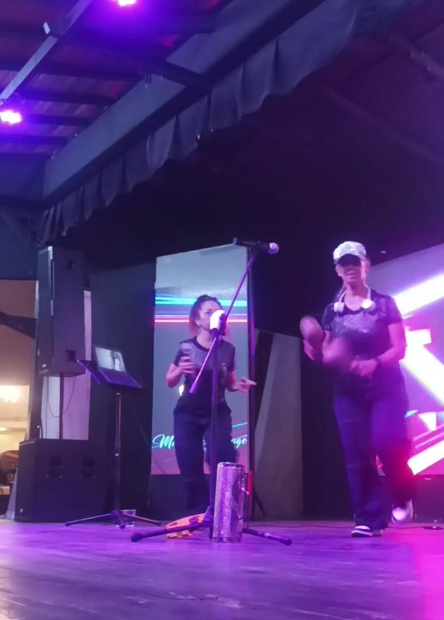 Two women are performing music on a stage. Both are wearing dark clothing and singing into microphones. One is playing maracas and wearing a backwards baseball cap, while the other is scraping a güiro. Behind them are large screens with colorful, abstract designs. The stage is lit with purple lighting. There are speakers and other musical equipment on the stage as well.