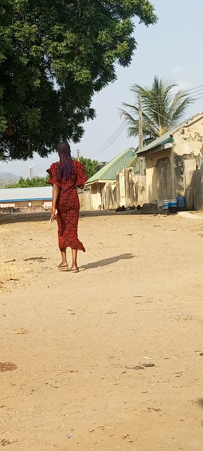 A female individual walks away from the camera on an unpaved dirt path in Adankolo, Nigeria