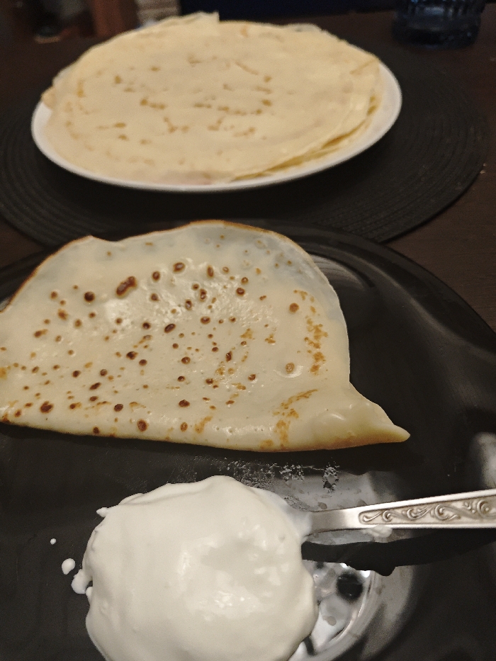 The image displays a close-up, elevated view of food prepared for consumption, located in Свистуха (кузяевский С/о), Russia. In the foreground, a single, folded blini or thin pancake, light beige with numerous small, dark golden-brown speckled areas, rests on a matte black plate. To the immediate lower left of the pancake, a metallic spoon, featuring an ornate handle design, holds a distinct spherical dollop of white, viscous sour cream. Some sour cream has diffused onto the black plate surface. In the background, slightly out of focus, a stack of approximately ten similar blini or pancakes is presented on a white plate. Both the black and white plates are positioned on a dark, circular, textured placemat, which rests on a dark brown table surface. A segment of a dark blue, possibly glass, vessel is partially visible in the blurred upper-right background. No individuals are present in the frame.