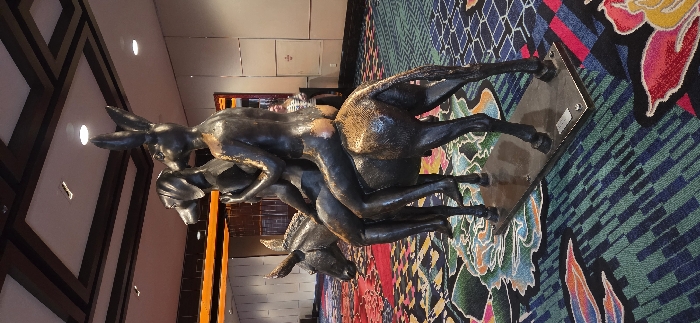 A bronze sculpture on a metal base sits atop a colorful patterned rug. The sculpture appears to depict two figures intertwined, possibly stylized human forms riding on what seem to be donkeys. The lighting is bright, reflecting off the polished surfaces of the metal base and the smooth bronze of the art piece. The surrounding interior is modern, with patterned walls and ceiling fixtures.