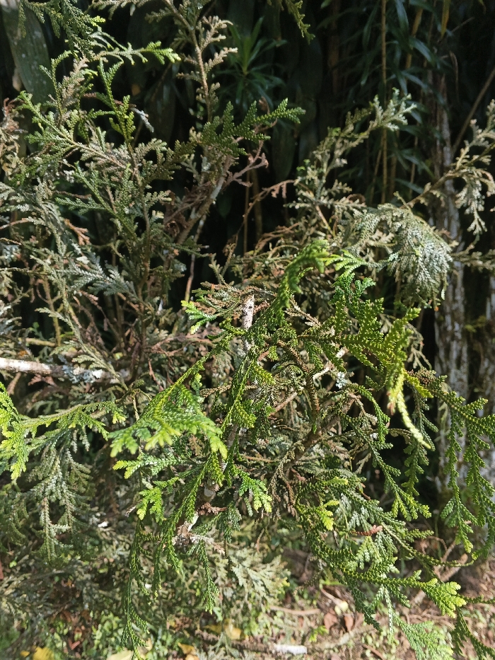 This image, captured in Baglung, Nepal, presents a close-up, matter-of-fact view of dense evergreen shrubbery. The central subject is a plant characterized by numerous small, scale-like leaves, which range in color from vibrant light green on fresh growth to darker green and desiccated brown-green on older sections. Near the upper-center of the frame, a single, small, white, elongated object, possibly an insect larva or cocoon, is visible attached to a branch. The background consists of out-of-focus dark green foliage and the lighter bark of a tree trunk on the far right. The scene is illuminated by natural light, producing distinct highlights on the upper leaf surfaces. No human subjects, animals, actions, or interactions are depicted.