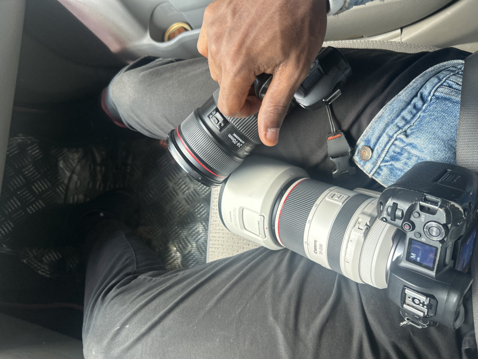 The image provides a close-up, downward-angled view inside a vehicle, focusing on the lap and legs of an individual wearing black trousers. A dark-skinned left hand is holding a black Canon RF 24-70mm f/2.8 L IS USM lens. Resting on the person's lap is a black Canon R-series mirrorless camera body, with its rear screen illuminated and displaying "M" (Manual mode), to which a white Canon RF 70-200mm f/2.8 L IS USM lens with an attached lens hood is mounted. A black camera strap with a quick-release buckle is visible, along with a small portion of a blue denim garment. The vehicle's interior features a textured metallic diamond-plate floor mat and light grey plastic paneling on the right side. The precise location within Abuja, Nigeria, is not identifiable from this interior vehicle scene.