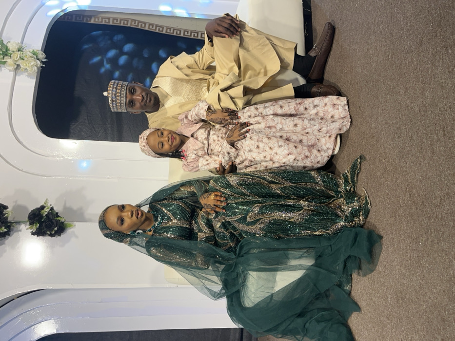 A man, a girl, and a woman are posed in traditional attire. The man wears a tan ensemble, including a matching hat and brown shoes. The girl wears a pink and white floral patterned outfit with a matching head covering. The woman wears a green sequined dress and a sheer green veil. They are seated on a white surface, possibly a stage or elevated platform, with some floral decorations visible. The floor is a muted brown carpet.