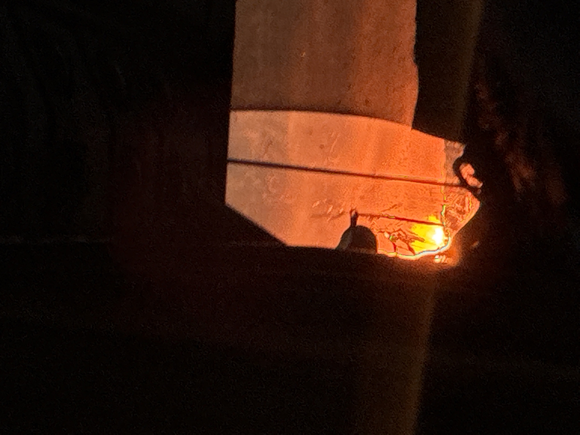Captured in Sofia, Bulgaria, the image shows a dimly lit, nighttime view through a partially obscured opening, possibly a window or doorway. A reddish-orange glow emanates from within, suggesting the presence of a fire or intense light source. A dark, indistinct figure is visible in the foreground, silhouetted against the light. The surrounding environment is dark and difficult to discern, giving the impression of a confined, internal space or a dark exterior. A thin, dark horizontal line cuts across the lit area, possibly a wire or other linear object. The focus is on the contrast between the bright interior and the dark surroundings.