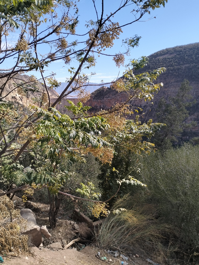 The scene depicts a daytime view of a mountainous area in Bin El Ouidane, Morocco, under a clear blue sky. In the immediate foreground, a dirt path or slope is visible, littered with discarded items including plastic bottles and other refuse. A large, broken concrete or stone object lies on the left side of the foreground. The midground is dominated by a deciduous tree with green leaves and numerous clusters of spherical, pale yellow fruits or berries, its branches extending across the frame. Behind this primary tree, additional green foliage and dense shrubbery are present, obscuring the ground below. The background reveals a deep valley framed by rugged, arid hills. A prominent concrete dam structure is visible spanning a section of the valley, with further distant, partially tree-covered mountainous terrain rising on the right side of the background. No individuals or specific actions are depicted.